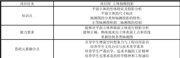 如基于OBE 理念的教学中划分的模块后,项目四立体轴测投影的主要知识、能力和思政目标见表 2。轴测投影讲解采用问题链式教学法教学流程, 问题 定 到逻辑拆解再到问题解决,逐步展开课堂教学。