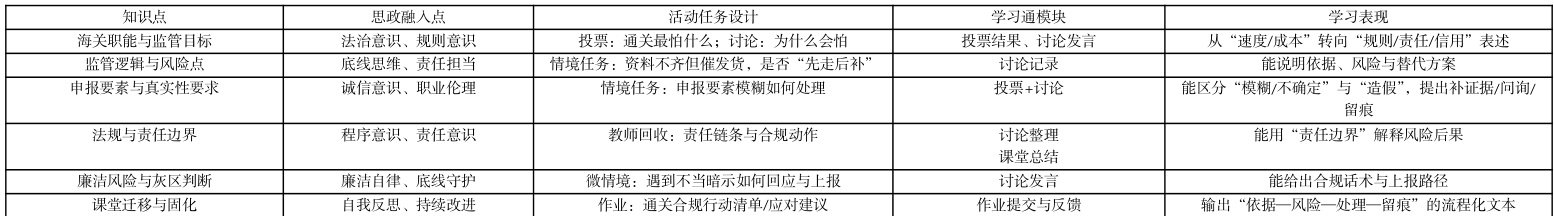 (1)知识目标:理解海关监管的基本逻辑与通关关键环节,掌握报关与申报要素的基本要求,识别常见通关风险点。
