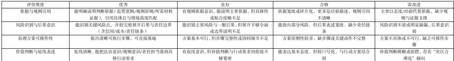 第二,学习产出作业用于检验学生能否将合规原则转译为可执行的行动方案,并通过量规引导学生提升“风险后果完整性”、“方案可操作性”与“底线表述清晰度”。