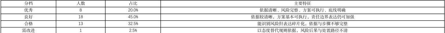 作业结果如表 4 显示,优秀占比 20.0% 、良好占比 45.0% 、合格占比 32.5% 、需改进占比 2.5%0. 总体来看,优秀与良好比例达到 65.0% ,多数学生能够在通关合规情境中形成较为清晰的判断与表达框架:能够说明决策理由,识别关键风险点,并提出相对可执行的处置方法。合格层级的学生虽能表达基本态度并识别部分风险,但在“依据引用的清晰度”与“步骤化呈现”的完整性上仍存在不足,表现为结论先行、理由笼统或缺少关键动作与责任边界说明。需改进作业主要问题在于以态度表达替代规则依据,或对风险后果缺乏具体化分析,尚未形成可迁移的岗位行动框架。