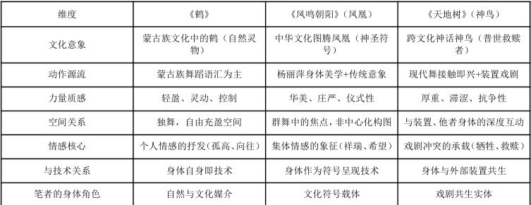 笔者毕业于舞蹈学院,身体既有学院派训练烙印,又在舞台实践中形成独特肢体特质,如修长线条、出色控制力和强表现力。这种特质与鸟类意象有天然亲和性,使笔者在多部作品中与“鸟”结缘。在第九届中国舞蹈“荷花奖”民族民间舞比赛独舞《鹤》中,以蒙古族文化为背景借鹤抒情;2024 年河南卫视春晚《凤鸣朝阳》里,在杨丽萍指导下饰演凤凰;2025 年在舞剧《天地树》中化身为神鸟。这三个角色虽都属鸟类意象,但在文化内涵、表现形式和技术要求上差异显著,构成完整研究谱系。