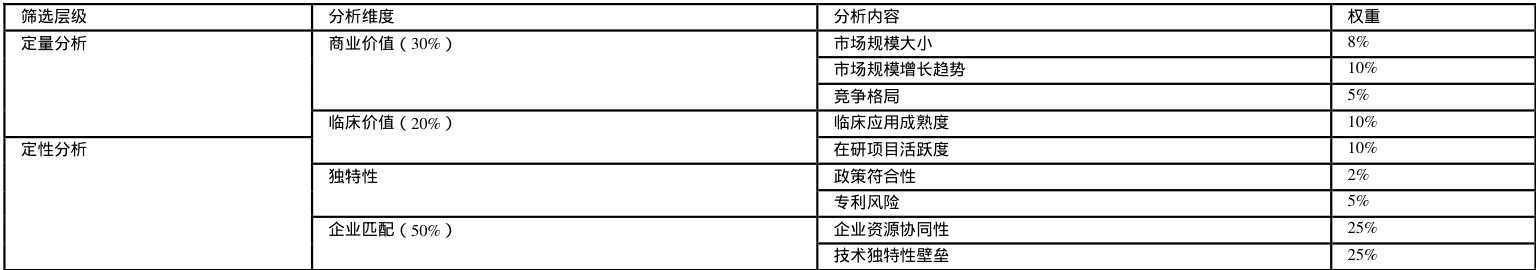 通过上述筛选,可以筛选出商业价值好;临床应用广泛及临床应用价值高;市场竞争中有增量机会;专利风险低符合政策发展;有技术独特性壁垒并与企业资源相匹配的项目。
