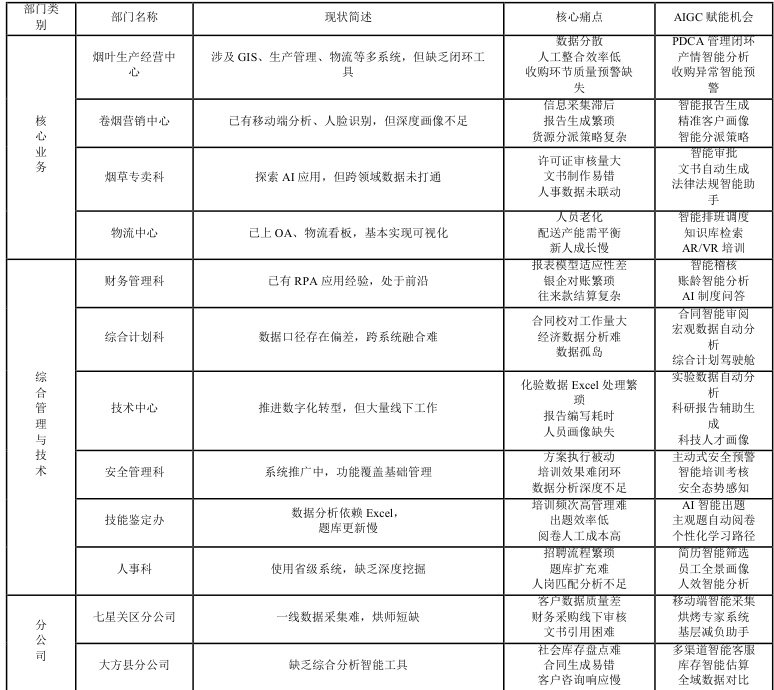 表 1毕节市烟草公司业务现状痛点与AIGC赋能机会