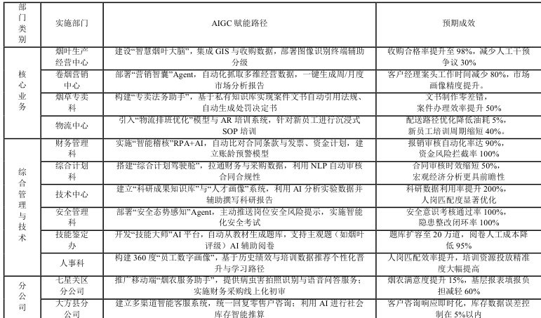 表 2毕节烟草各部门AIGC赋能路径与预期成效