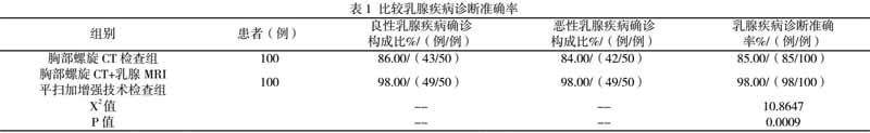 胸部螺旋CT+乳腺MRI平扫加增强技术检查组良性乳腺疾病确诊构成比98.00%(49/50)、恶性乳腺疾病确诊构成比98.00%(49/50),均高于胸部螺旋CT检查组的86.00%(43/50)、84.00%(42/50)。胸部螺旋CT+乳腺MRI平扫加增强技术检查组乳腺疾病诊断准确率98.00%(98/100),高于胸部螺旋CT检查组的85.00%(85/100)。见表1。