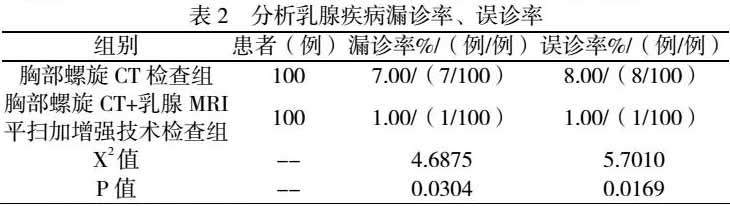 胸部螺旋CT+乳腺MRI平扫加增强技术检查组检查诊断乳腺疾病漏诊率、误诊率均更低[1.00%(1/100)、1.00%(1/100),分别同胸部螺旋CT检查组的7.00%(7/100)、8.00%(8/100)相对比](p<0.05)。见表2。