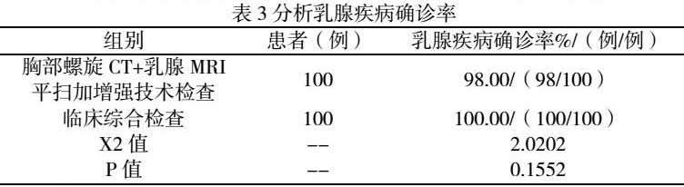 胸部螺旋CT+乳腺MRI平扫加增强技术检查组乳腺疾病确诊率98.00%(98/100),同临床综合检查比较无统计学意义(p>0.05)。见表3。
