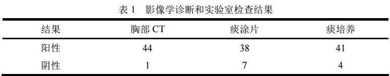 45例患者有44例胸部CT显示活动性肺结核,另一人为支气管结核(影像学检查肺部未见异常)。38例痰涂片找抗酸杆菌为阳性,7例为阴性;痰结核菌培养41例阳性,4例阴性(表1)。34例以咳嗽咳痰为主要的临床症状;因喉部症状就诊有11例,其中咽痛4例,声嘶3例,两者均有的4例;