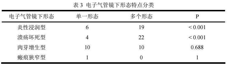 以炎性浸润型为主的多个形态病例中有19例,在单一形态有6例,差异具有统计学意义(P<0.001);以溃疡坏死型为主的在多个形态中有22例,在单一形态中有4例,差异具有统计学意义(P<0.001);以肉芽增生型为主的在多个形态和单一病灶无明显差异(P=0.688);瘢痕狭窄型因病例数为1,没有比较意义(表3)。