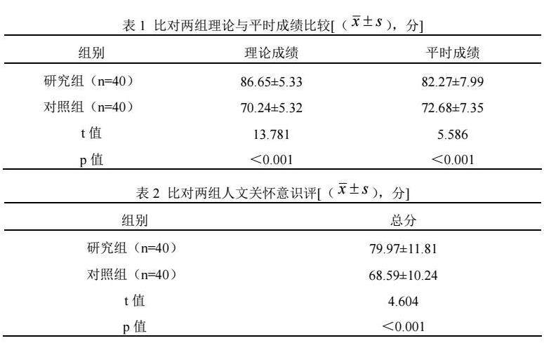 两组在校生理论与平时成绩评分、人文关怀意识评分。
