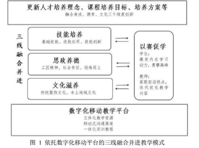 更新人才培养理念,更新融合美技、德育、文化三个维度创新课程育人理念。根据课程专业特色,提出“立德为先、美技为本、文化为根、创新为魂”课程育人目标,兼顾德育、智育和美育,并注重文化底蕴和创新意识。以更加全面综合的人才培养观为指导,在专业教学上为服装“塑外形”,在教书育人上为服装人“塑精神”。