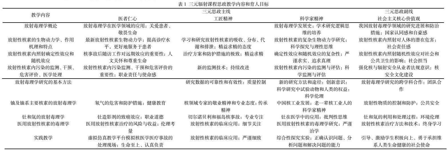 温州医科大学放射医学专业是医防融合的专业,致力于肿瘤放射治疗,又兼具辐射防护特色。该专业人才培养的目标是面向临床医师,培养具有肿瘤放射治疗、放射物理、辐射防护的,具有一定创新能力的应用型放射医学专业人才。既需要培养“医者仁心”的医学人才,有需培养具有“工匠精神”的高技能人才。同时,放射医学是随着核能和核技术的发展而逐步建立起来的一门医学学科。中国核工业的发展是由无私奉献的老一辈科学家们开创的,蕴含了探索未知、追求真理、攀登科学高峰的科学家精神的丰富思政元素。因此放射毒理学的思政建设目标注重“医学”和“技术”两个主线,分别对应医学类和工学类课程。并且这两个主线并不独立,而是相互影响且相互渗透。中间交互部分包含理学类课程,分别形成“医者仁心”、“工匠精神”和“科学精神”三元辐射思政模式。再以三个主线分别辐射,结合通识教育课程和基础课程中的公德、私德等社会主义核心价值观,系统设计放射医学课程思政建设,形成课程思政与放射医学专业教育同向同行的协同培养效应,培养德智体美全面发展的高素质放射医学专门人才。