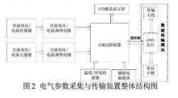 电气参数采集与传输装置以STM32单片机为控制核心,外接交直流电压电流互感器、电流调理电路、电压调理电路、辅助电源模块、环境温度检测模块、数据传输模块和显示模块等,实时监测微电网系统的电气参数和环境信息,确保系统的安全、稳定运行。整体结构如图2所示。