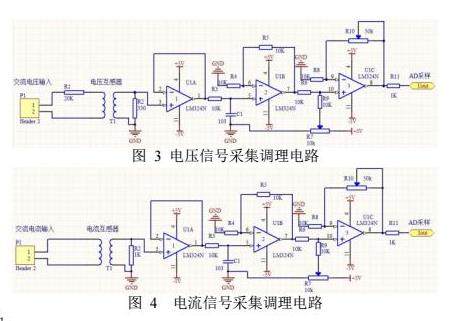 在电气参数采集部分,交流电压和电流的测量采用霍尔传感器和电流互感器。具体的电压与电流信号采集与调理电路如图3和图4所示。电路设计中,电气参数的测量依赖于互感器,后续的信号调理电路设计保持一致。以交流电流采集调理电路为例,系统使用电流互感器(DL-CT03C2)测量交流电流,通过采样电阻将互感器输出转化为与输入电流变化一致的电压模拟信号。该信号经过LM324运算放大器、电压跟随器、滤波器和信号放大器处理后,送入STM32单片机的AD转换模块进行采集,最终得出电流参数。通过在STM32控制器内进行FFT运算,可以计算出电压电流的有效值、瞬时值和有功功率,并根据周期内测得的信号瞬时值,还原出所测电气信号的波形。