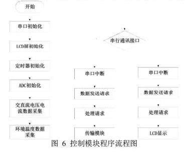 在初始化完成后,系统进入数据采集阶段。控制模块负责从电压、电流传感器及环境监测设备(如温湿度传感器)中采集数据。采集到的电压和电流信号通常为模拟信号,控制模块将这些信号传送至信号处理模块进行处理。信号处理模块对模拟信号进行放大、滤波和AD转换,确保数据的准确性与稳定性。处理后的数据包括电气参数(如电压、电流、功率因数等)和环境参数(如温度、湿度),并将其传送至显示模块进行实时展示。控制模块还具有故障监测和报警功能。当采集的电气参数超出预设的安全范围时,控制模块会触发报警并显示故障信息,确保系统在出现问题时及时作出反应,避免潜在风险。控制模块通过定时器中断机制保证数据的定时采集,确保系统能够定期获取电网运行状态,并进行信号分析和处理。控制模块的工作流程如图6所示。