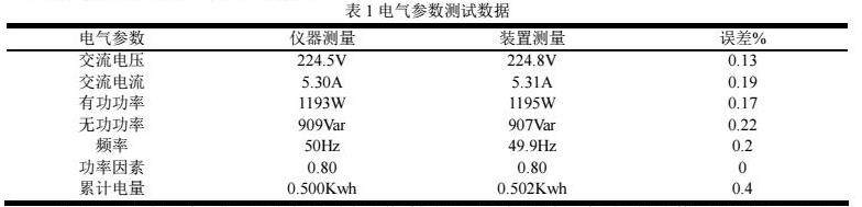 在实验室环境下,以单晶硅光伏发电系统为测试对象,连接了1.5KW的RLC负载,并使用实验样机、示波器、数字万用表和功率分析仪等仪器对电气参数进行了测量。通过这些仪器,对单相交流电的相关电气参数进行了详细检测,具体测量结果如表1所示。