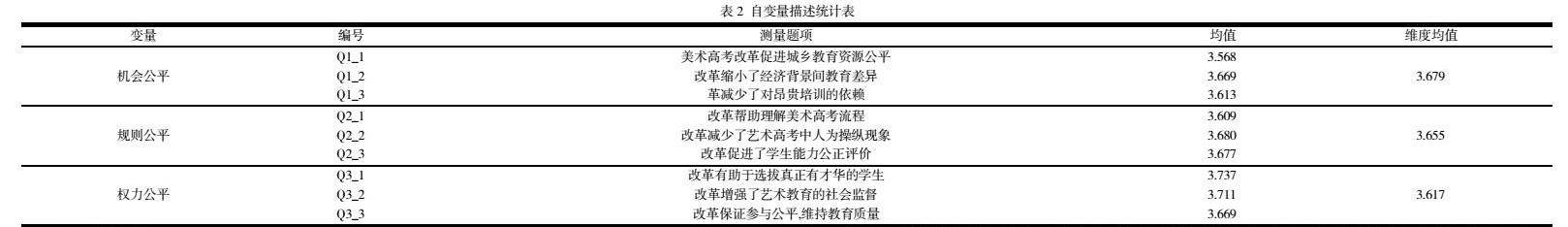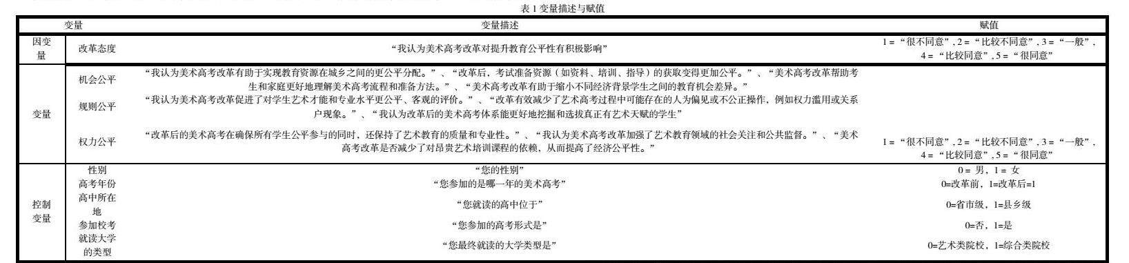 本研究中,变量分为因变量、自变量和控制变量,以探讨美术高考改革对教育公平性的影响。因变量为改革态度,自变量包括机会公平、规则公平和权力公平,控制变量则涵盖性别、高考年份、高中所在地、是否参加校考以及就读大学类型。各变量通过Likert量表进行测量,赋值范围为1至5,分别表示不同程度的同意与差异(详见表1)。