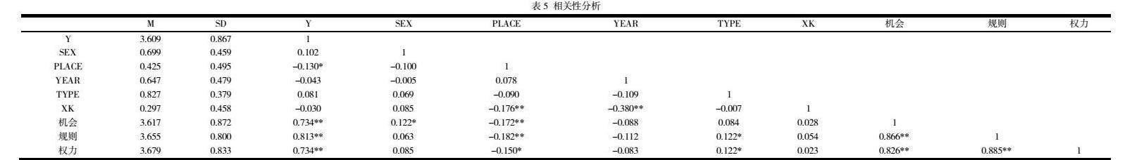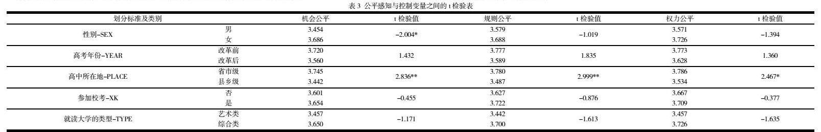 表3中对各控制变量群体对美术高考改革公平感知情况进行了差异检验。结果显示,性别在机会公平感知上的差异显著,男性和女性在此维度的感知不同(p<0.05),但在规则公平和权力公平上无显著差异。高考年份方面,改革前后的群体在机会、规则和权力公平感知上均未显示显著差异。高中所在地对公平感知影响较大,省市级和县乡级毕业生在机会公平和规则公平上的差异显著(p<0.01和p<0.05),但在权力公平上差异不显著。此外,是否参加校考以及就读大学的类型(艺术类与综合类)对三种公平感知维度均未产生显著影响。