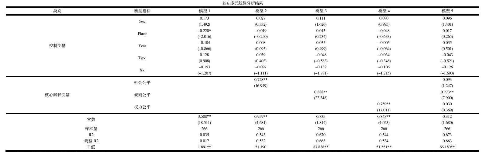 表5显示了影响因素的多元线性回归结果。其中,模型1包含控制变量,模型2包含控制变量与机会公平因素,模型3包含控制变量、规则公平因素,模型4包含控制变量、权力公平因素,模型5包含控制变量、机会公平、规则公平和权力公平因素。方差膨胀因素值(VIF)小于10,说明模型中不存在多重共线性。