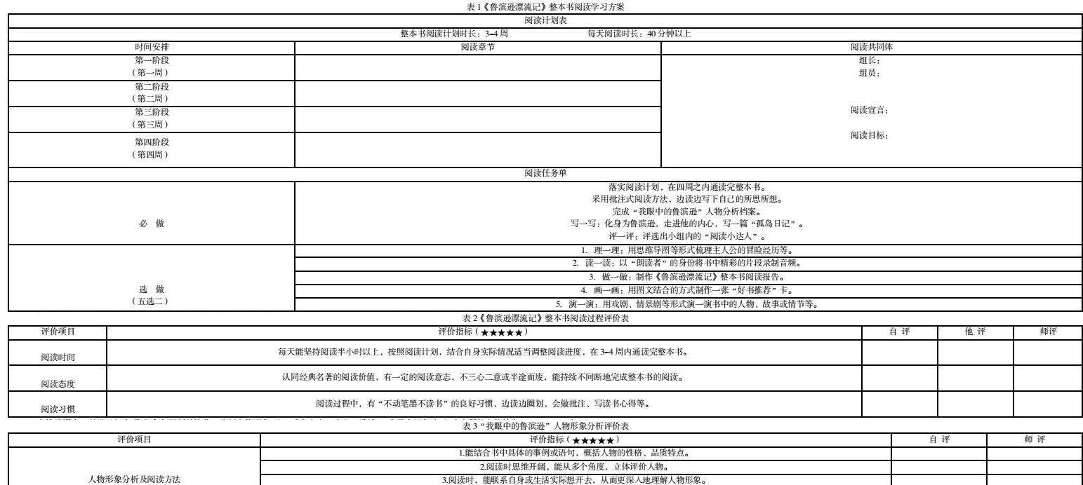 如:《鲁滨逊漂流记》的“读中推进课”,教师在确定教学目标、设计评价方案的基础上设计了以下几个教学环节:
