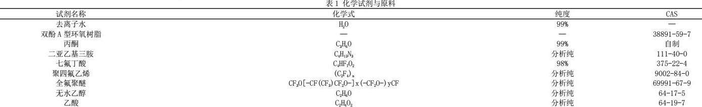 将一定量的PFPE(0、0.1 g、0.2 g、0.3 g、0.4 g)加入10 ml去离子水中稀释,再将40g实验室自制的有机涂料加入稀释后的PFPE中,超声分散15 min,再用磁力搅拌器搅拌10 min,得到氟化有机涂料。然后在有机涂层中加入2 g ZnO粉末,超声分散15 min,用磁力搅拌器以1000 rpm搅拌10 min,制得纳米有机复合防冰溶液。将溶液喷在玻璃上,将样品置于温度为80℃的干燥箱中4小时,将干燥后的样品置于醋酸溶液中酸化,然后将样品干燥,得到纳米有机复合防冰涂层。
