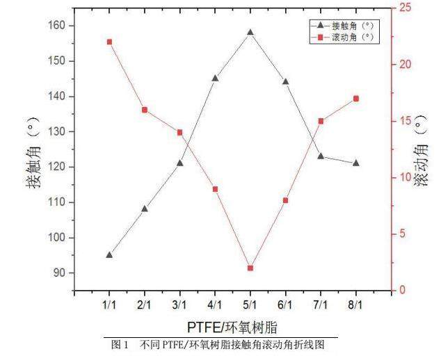当PTFE/环氧树脂为1/1时,整个涂层肉眼可见的白色PTFE稀疏的分布在环氧树脂上,此时起疏水性的主要是环氧树脂的本身的润湿性能,随着PTFE添加量的不断增加,涂层表面逐渐形成致密的微纳米结构层,使得涂层具有良好的润湿特性。