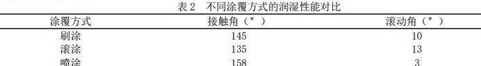 制备出新型纳米有机复合防冰涂层后,采用刷涂、滚涂、喷涂的方式在载玻片上进行涂层的涂覆工作,润湿性能如表2所示。