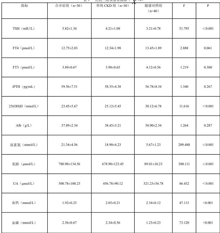 同时选取 40 例同期体检健康者作为健康对照组。纳入标准:未接受 MHD 治疗;无 CKD 病史或相关诱发史;近 3 个月内均未服用维生素 D 或影响甲状腺功能的药物;不存在对 状腺功 影响的疾病或自身营养失衡。合并症组男 12 例,女18 例,年龄 18 - 65 岁,平均(38.5±8.2) 单纯 C D 组男 14 例,女 16 例,年龄 20 - 68 岁,平均(40.2±7.9)岁;健康对照组男 17 例,女 23 例,年龄19 - 66 岁,平均(39.1±8.0)岁。三组性别、年龄等一般资料无显著差异(P>0.05),具有可比性。