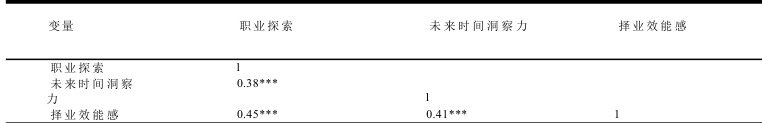 未来时间洞察力、职业探索和择业效能感的描述性统计结果如表1 所示。