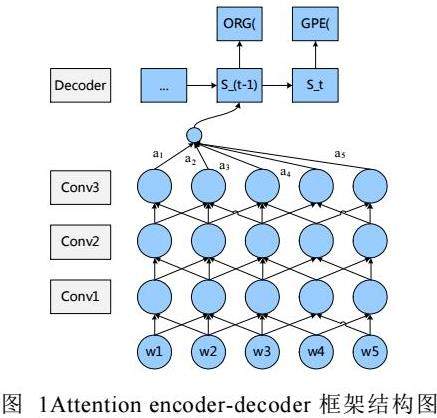 该模型包括三个模块,第一个模块是使用一系列的1-维卷积核生成输入序列的特征表达,第二个模块是使用注意机制构建网络层,第三个模块是使用基于双向GRU或者LSTM编码器和解码器构成,通过解码器计算最大条件概率,从而完成嵌套实体的识别。