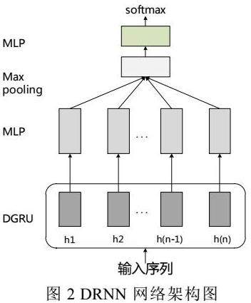 针对以上问题,本文应用DRNN(Disconnected Recurrent Neural Networks)模型,通过限制RNN模型信息的流动,将位置不变性引入RNN模型中。这使得DRNN模型既能捕捉长距离依赖信息,又可以很好地抽取关键短语信息。具体来说,DRNN会阻断RNN模型的信息流动,使其最多只能传递固定的步长k。这样的话,每个时刻的隐层状态就只和当前词以及前k-1个词相关。DRNN是一种通用的模型框架,可以应用在很多任务中,主要将其应用在意图分类任务中。DRNN采用GRU作为循环单元,得到DGRU(Disconnected Gated Recurrent Unit)模型。首先将DGRU的每个隐层表示送入MLP中,来抽取更高层的特征信息。其次,通过Max Pooling来抽取整个文本中最重要的信息,然后通过一层MLP送入softmax中进行分类。
