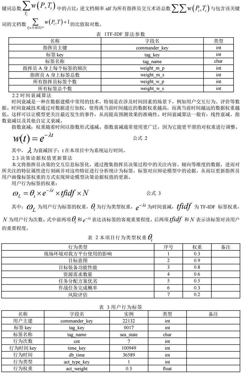 本文应用用户画像技术构建指挥员指挥决策动态画像,用户信息提取自实验、测试过程中指挥员与指控系统的语音、文字交互过程[8],画像标签将作为决策过程中的用于计算辩论结果的各项论据,标签权重将用于计算融合决策结果[9]。