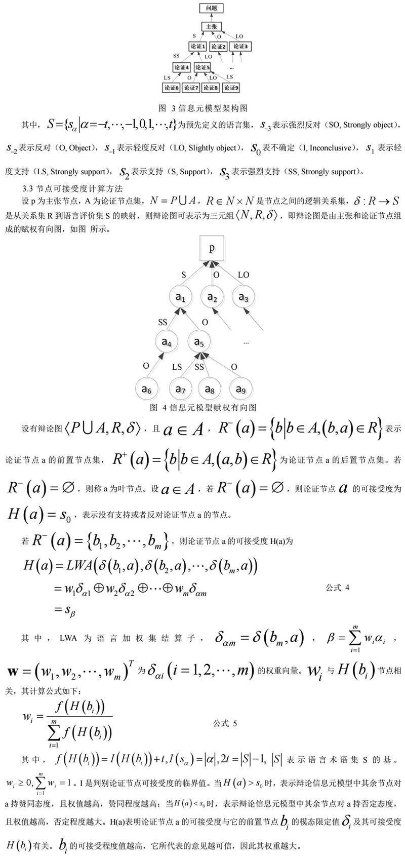 其中,表示语言术语集S的基。。I是判别论证节点可接受度的临界值。当时,表示辩论信息元模型中其余节点对a持赞同态度,且权值越高,赞同程度越高;当时,表示辩论信息元模型中其余节点对a持否定态度,且权值越高,否定程度越大。H(a)表明论证节点a的可接受度与它的前置节点的模态限定值及其可接受度有关。的可接受程度值越高,它所代表的意见越可信,因此其权重越大。