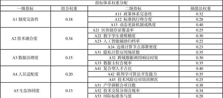 指标池的选择主要来源于以下三个方面:政策文本方面,提取《GB/T 50328-2014》核心条款与配套政策,选取包括“区块链存证覆盖率”“动态更新机制成熟度”等 12 项;企业实践方面,选取华为“边缘节点部署密度”、商汤“联邦学习算法”等 9 项;学术研究方面,提取近三年CNKI 核心期刊与前沿课题的高频词“数据主权合规率”“跨域响应时效”等 11 项。