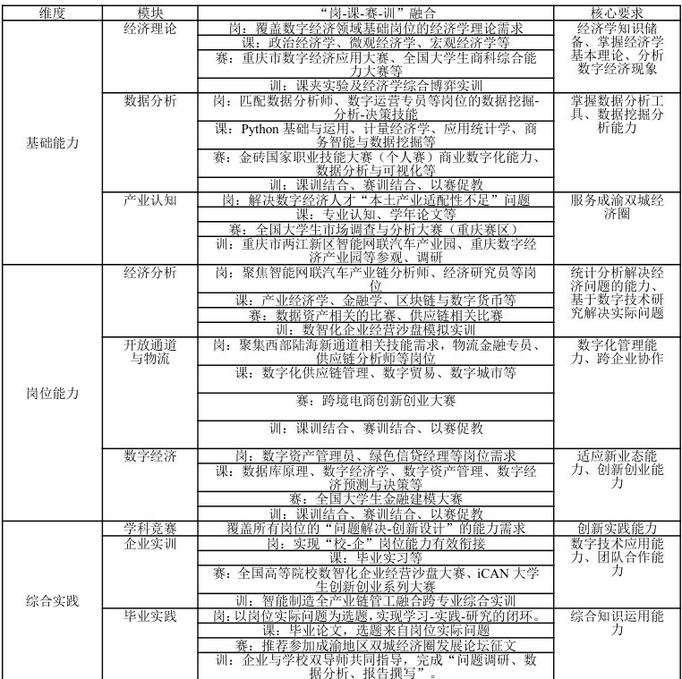 基于上述原则,本研究以重庆城市科技学院数字经济专业为案例,对接重庆本土产业需求与成渝地区双城经济圈建设定位,构建涵盖“基础能力、岗位能力、综合实践”三维能力框架,探索“岗-课-赛-训”四位一体人才培养模式。具体课程设置框架如下表:
