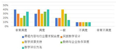 根据调查数据显示,在“教学内容与行业需求契合度”“实践教学设计”“教学资源支持”“教师与企业协作深度”“教学评价方法”上,从课程改革前的40%-50%区间的满意度,上升到课程改革后的60%-80%,提升幅度达20%左右。