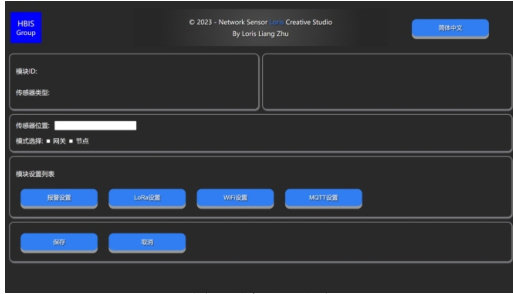 设计开发了一套 HMI 界面,用于智能传感器参数设置。能为用户带来友好的操作体验,使用户能够轻松地配置传感器参数。分别包括:(1)语言切换:以满足不同地区用户的需求。(2)设备ID 号:方便管理和识别各个设备。(3)传感器类型:以便用户正确配置不同类型的传感器。(4)传感器数值:显示传感器实时采集的数值,让用户随时了解当前环境状态。(5)设备位置信息。(6)设备模式选择。(7)报警阈值设置。(8)LORA 参数设置:确保数据传输的稳定性和可靠性。(9)WiFi 参数设置。(10)MQTT 参数设置:实现数据的远程传输和管理。(11)保存设置以及取消设置。通过以上功能模块,用户可以方便地对智能传感器的参数进行配置,以满足不同应用场景的需求,提高了操作的便捷性和灵活性。用户显示界面如图5 所示。
