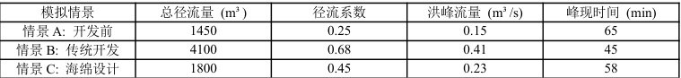 峰值流量削减:海绵系统的洪峰流量为 0.23m3/s ,相较于传统开发模式( (0.41m3/s) )削减了 44% ,且非常接近开发前的水平( (0.15m3/s) 。