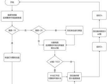 从图 2 中得知,该机器人先对温度进行监测,当温度低于最低阈值时要点亮保温灯对圈舍加温,此过程因为保温灯实际在选型时可以选用补光能力与补光灯相似的型号,这时光照即使低于预定阈值也可以不开启补光灯,用保温灯也足够进行补光了。当温度高于最高温度阈值时,要启动风机降温,此时仍要继续监测光照强度,选择是否开启补光灯,温度在适宜温度内同理要监测光照强度来选择补光灯开启状态。当所有温度和光照使用的调控模块都完成识别及操作后,四位数码管要显示温度数值和光照数值(本模型选用 ad 值)先显示温度数值中间加入两秒演示再显示 ad 值,并在进入下一次循环前也延时两秒以便读取数值。