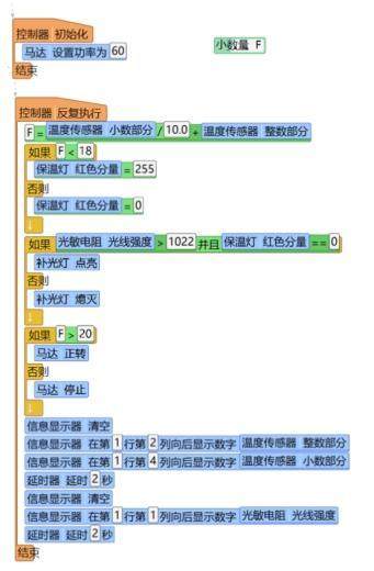 此程序的编写参照图 3 所示的圈舍环境调控机器人流程图,在编程时依旧在控制器初始化中引入马达功率指令,由于模型马达功率对实际参考并无意义,所以仅以风机转动即可,设置马达功率为60W。在温度显示时由于使用的温度传感器数值可以显示到小数点后一位,因此在系统进行温度数据判断时,需要使用小数量对比,因此引入工具台元素部分的“小数量F”。