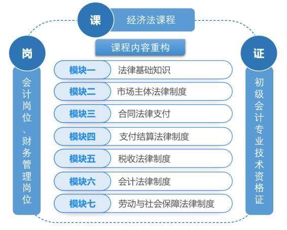 课岗 课程内容重构 证模块- 法律基础知识模块二 市场主体法律制度模块三 合同法律支付模块四 支付结算法律制度模块五 税收法律制度模块六 会计法律制度模块七 劳动与社会保障法律制度