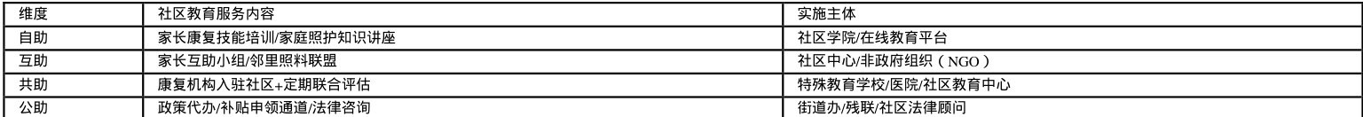 如上表所示,社区作为整个支持系统中的关键枢纽,承担着组织与协调各主体资源的重要职责,并且持续贯穿于各个环节,以实现社区教育服务的高效供给与精准实施,满足特殊儿童家庭多样化需求。如在自助服务维度,社区可联动社区学院与在线教育平台,精准对接家长康复技能培训及家庭照护知识讲座的资源需求,让服务能切实触达有需要的家庭;在互助服务中,助力社区中心与非政府组织高效开展家长互助小组和邻里照料联盟活动;共助服务过程中,则通过积极引入康复机构,协调特殊教育学校、医院等多方,保障联合评估等工作的有序推进;在公助服务方面则为特殊儿童家庭打通政策代办、法律咨询等通道,提供坚实保障,发挥着多方统筹协调的重要功能。