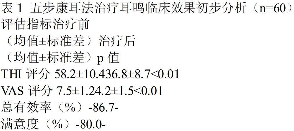 根据初步的临床观察与现有资料显示,五步康耳法在耳鸣患者中展现出良好的应用效果。一项针对 60 例耳鸣患者的临床观察表明,该疗法在治疗 4 周后总有效率达到 86.7% ,其中显效率为 43.3% 。患者耳鸣严重程度通过 Tinnitus Handicap Inventory(THI)评分进行评估,治疗后平均评分由基线的58.2±10.4 下降至 36.8±8.7( p<0.01AA) ),显示出显著的统计学差异。同时,Visual Analog Scale(VAS)评分用于评估耳鸣响度主观感受,由治疗前的 7.5±1.2 降至 4.2±1.5( (p<0.01) 。在满意度方面,超过80%的患者报告对治疗效果表示“满意”或“非常满意”,尤其对睡眠质量及情绪状态的改善评价较高。