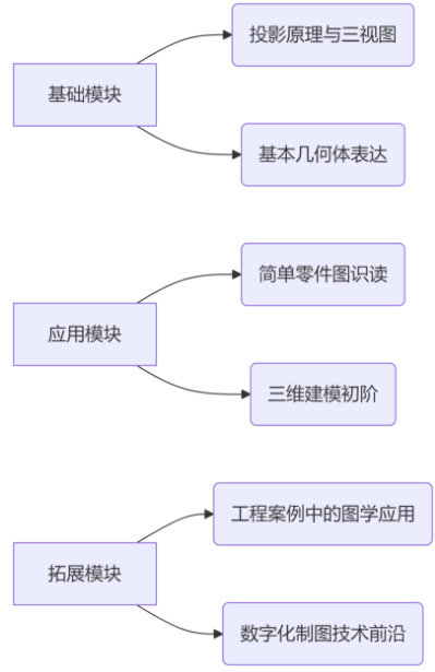 此次工科通识课建设将《画几与制图》按模块形式重构了整个教学内容,具体模块分为: