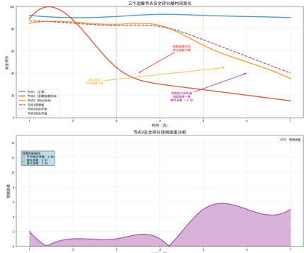 我们为三个边缘节点生成了连续 7 天的监控数据,并利用本系统进行安全评分。随后,我们手动对节点 2 注入容器逃逸攻击,对节点 3进行 DDoS 流量攻击。