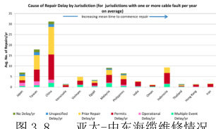 下图 3.8 展示了亚太-中东地区主要国家的海缆维修延误的原因分类统计情况,可以看到中国是发生海缆故障频率和次数最高的地区,维修资源紧张和许可证等待也是导致延误的最主要原因。