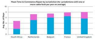 政府的要求和许可证规则一定程度也会影响海缆故障的维修响应时间,例如:委内瑞拉的船舶临时进口要求,印度的担保规定,印度尼西亚的海运权规定,埃及的安全检查规定,伊朗的制裁合规等。从全球范围来看,政府许可在海缆维修领域的最佳实践依然以欧洲为主,如英国、法国、比利时、荷兰、南非等,这些国家采用预授权制度,因此维修船可以立即启动,其平均等待时间一般在一周以内。但在部分国家,特别是有额外特殊审批制度的国家,平均等待时间可达 45 天左右,最严重的地区等待时间可达到 85-90 天。