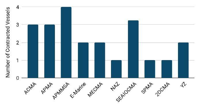 随着国际政治环境的风云变幻以及海缆系统朝着更复杂和多样化的方向发展,传统维护区模式和私营维护模式凭借各自独特的特点,在现代海缆维护体系中都发挥着不可或缺的作用,成为保障海缆稳定运行的重要力量。如按里程来划分的话,目前全球海缆的维护模式中维护区承担了一半以上的份额,详细份额如图 2.3,各维护区现有维修船舶资源情况详见图 2.4。