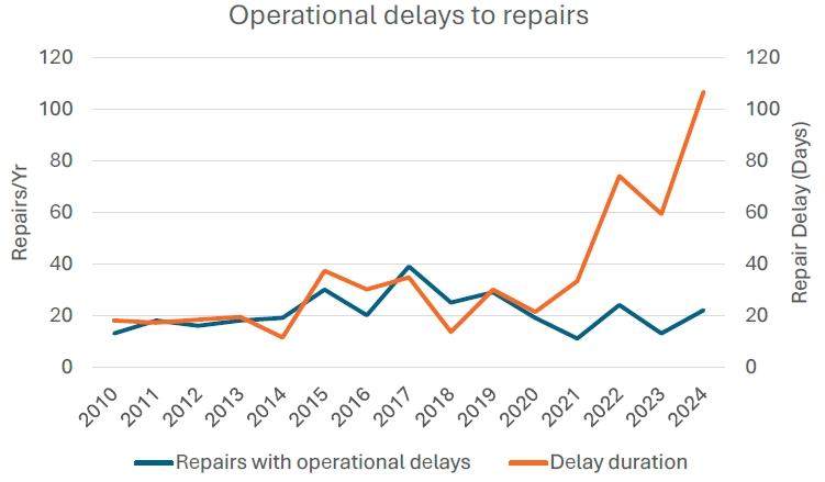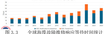 尽管在全球范围内,海缆每年出现的故障次数并未呈现出明显的波动变化,且海缆维修船的数量也基本保持稳定,未出现显著的增减情况,然而,故障发生后维修力量的响应时间却呈现出持续增长的态势。近十多年来关于这一情况的详细统计数据,具体可见图 3.3。