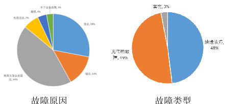 从故障原因来看,有 86%的故障是由捕鱼和锚泊行为导致的,其余 14%的故障则由海底地质活动、磨损或水下设备故障引起。而从相应导致的故障类型来看,绝缘故障和光传输故障基本各占一半。